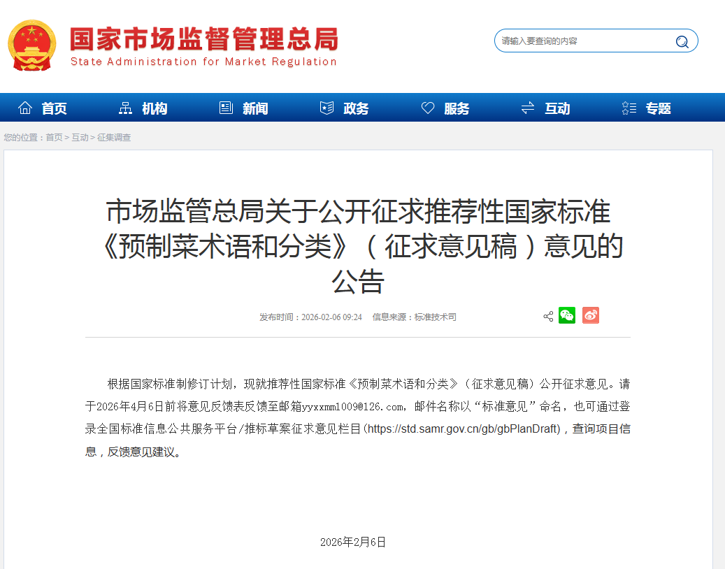 根据国家标准制修订计划,现就推荐性国家标准《预制菜术语和分类》(征求意见稿)公开征求意见。请于2026年4月6日前将意见反馈表反馈至邮箱yyxxmm1009@126.com,邮件名称以“标准意见”命名,也可通过登录全国标准信息公共服务平台/推标草案征求意见栏目(https://std.samr.gov.cn/gb/gbPlanDraft),查询项目信息,反馈意见建议。