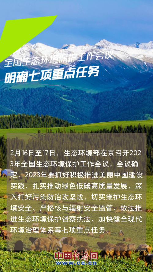 2月16日至17日,生态环境部在京召开2023年全国生态环境保护工作会议。会议确定,2023年要抓好积极推进美丽中国建设实践、扎实推动绿色低碳高质量发展、深入打好污染防治攻坚战、切实维护生态环境安全、严格核与辐射安全监管、依法推进生态环境保护督察执法、加快健全现代环境治理体系等七项重点任务。【详情】