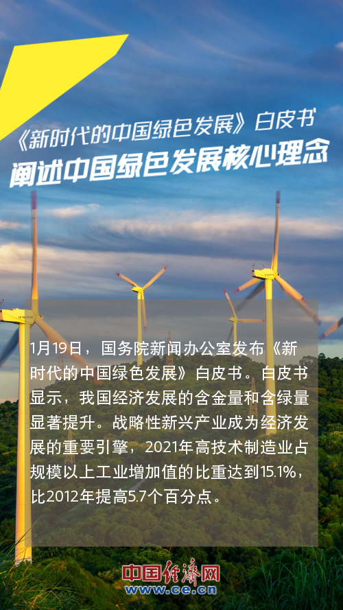 1月19日,国务院新闻办公室发布《新时代的中国绿色发展》白皮书。白皮书显示,我国经济发展的含金量和含绿量显著提升。战略性新兴产业成为经济发展的重要引擎,2021年高技术制造业占规模以上工业增加值的比重达到15.1%,比2012年提高5.7个百分点。【详情】