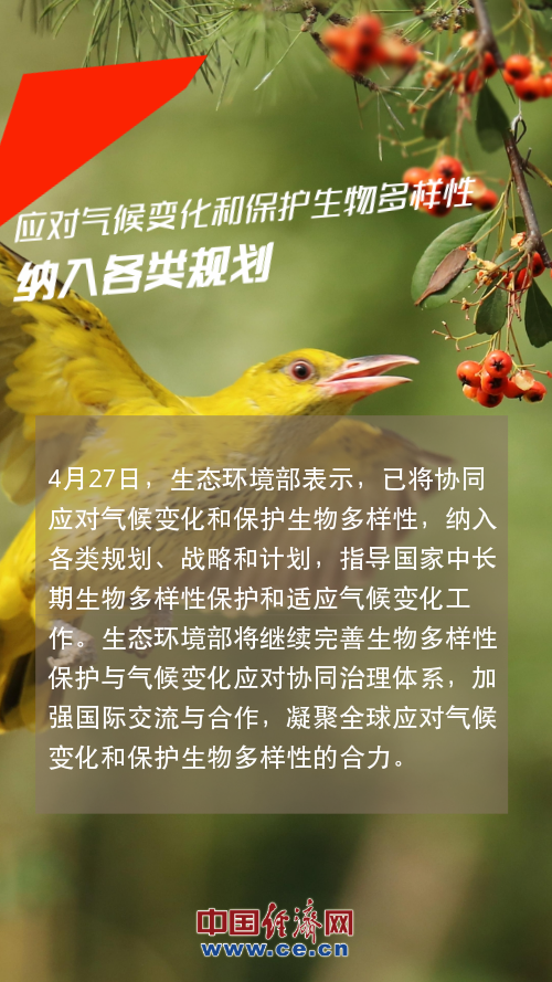 4月27日,生态环境部表示,已将协同应对气候变化和保护生物多样性,纳入各类规划、战略和计划,指导国家中长期生物多样性保护和适应气候变化工作。生态环境部将继续完善生物多样性保护与气候变化应对协同治理体系,加强国际交流与合作,凝聚全球应对气候变化和保护生物多样性的合力。【详情】