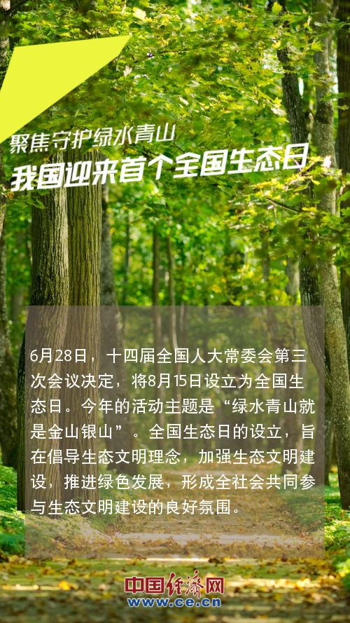 6月28日,十四届全国人大常委会第三次会议决定,将8月15日设立为全国生态日。今年的活动主题是“绿水青山就是金山银山”。全国生态日的设立,旨在倡导生态文明理念,加强生态文明建设,推进绿色发展,形成全社会共同参与生态文明建设的良好氛围。