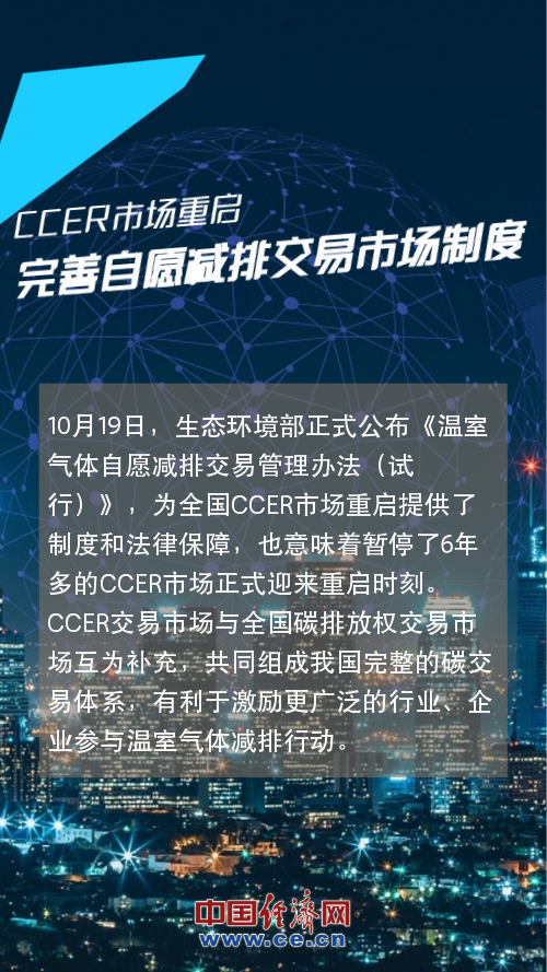 CCER即国家核证自愿减排量。10月19日,生态环境部正式公布《温室气体自愿减排交易管理办法(试行)》,为全国CCER市场重启提供了制度和法律保障,也意味着暂停了6年多的CCER市场正式迎来重启时刻。