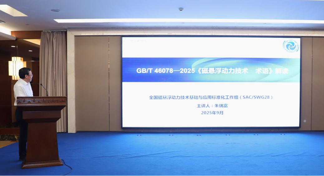 发布仪式现场,标准起草组成员、山东大学教授、博士生导师朱瑞富阐释了《磁悬浮动力技术 术语》(GB/T 46078—2025)的立项背景、编制过程、内容解读、实施意义等内容。
