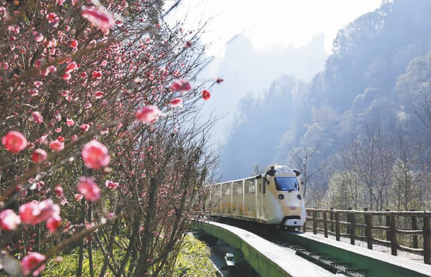 近年来,湖南省张家界市坚持生态优先、绿色发展,区域生态环境质量持续改善。近日,张家界国家森林公园梅花盛开,风景美不胜收。图为观光电车行驶在梅花丛中。 新华社供图
