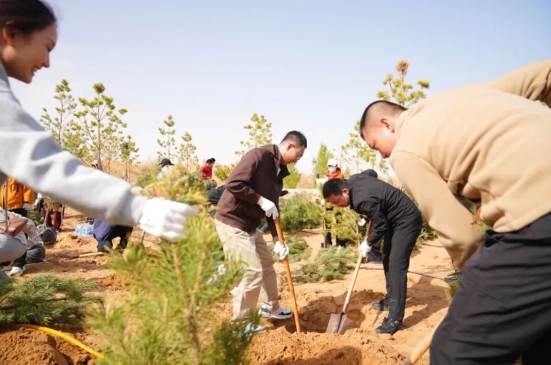在各植树点,党旗在大漠上飘扬。在治沙专家指导下,植树队伍分工明确,因地制宜采用不同技术,确保栽植质量,让每一棵苗扎根生长,现场忙碌而有序。