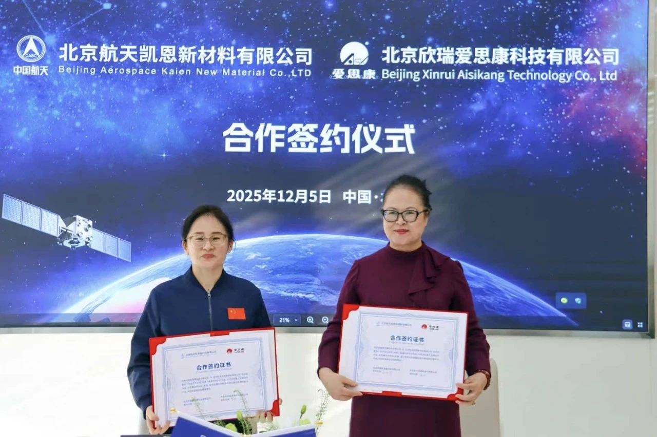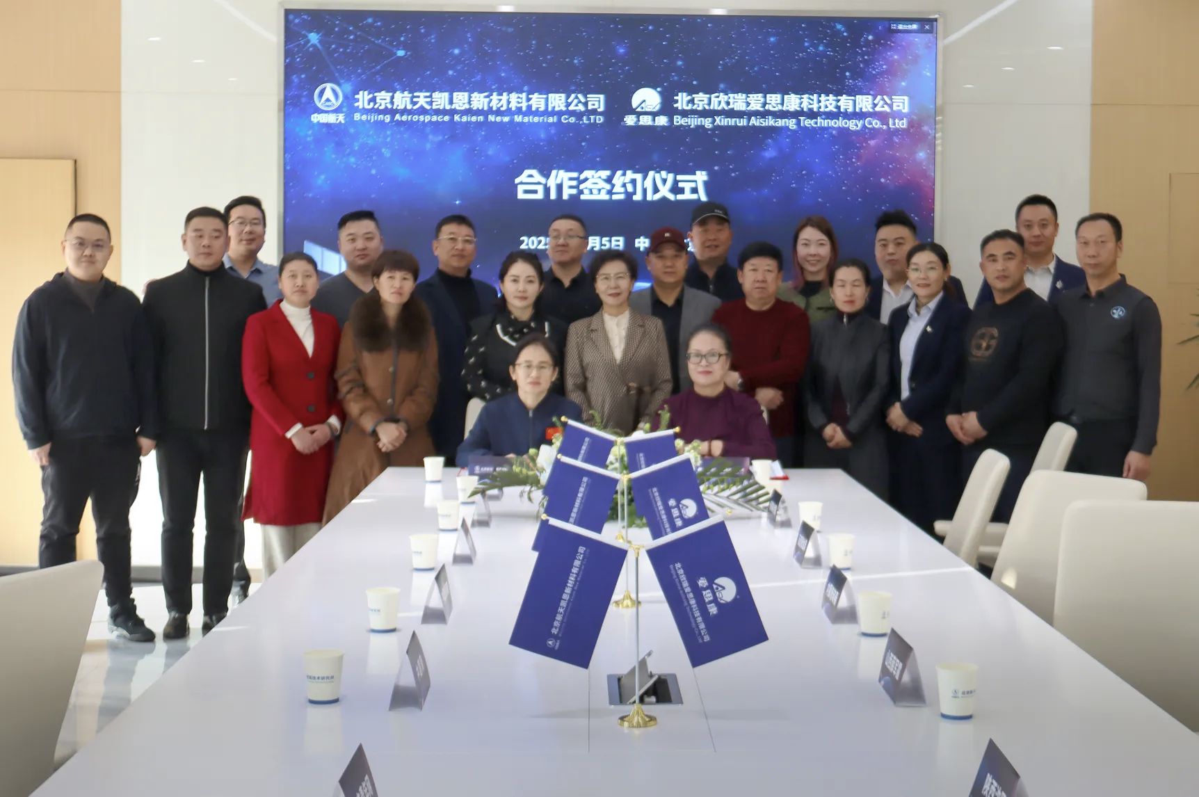 中国经济网北京12月8日讯(记者许子杰)2025年12月5日,专注于健康领域的北京欣瑞爱思康科技有限公司(以下简称爱思康公司)与北京航天凯恩新材料有限公司正式举行深度合作签约仪式。此次强强联合,标志着国家级航天新材料技术与健康产业实现深度跨界融合,是响应国家航天技术民用化、推动科技创新普惠民生的重要实践,为健康科技产业高质量发展注入航天级动能。