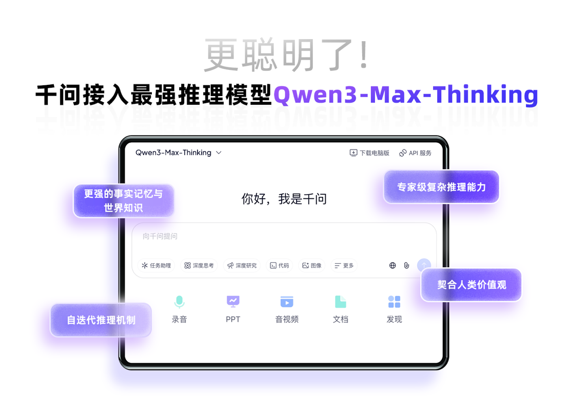 1月26日,阿里正式发布旗舰推理模型Qwen3-Max-Thinking,AI助手千问同步在PC端和网页端(qianwen.com)接入这一国内最强“AI大脑”,千问App也即将接入。用户只需在模型选择栏中一键切换,即可体验更为强大的推理能力。