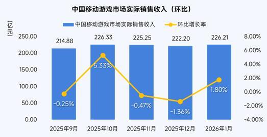 2026年1月,中国移动游戏市场实际销售收入达到226.21亿元,环比增长1.8%,同比下降1.52%。王旭表示,从环比来看,新游戏如《逆战:未来》和《明日方舟:终末地》的上线为市场带来了一定增量,同时成熟期产品如《王者荣耀》《和平精英》通过运营活动也贡献了收入增长:《王者荣耀》凭借优质的内容更新与成熟的商业化运营,取得环比增长;《和平精英》上线“暮色玫影-艾丽娅”神装套装及叙事任务,版本更新同步上线地图重制、新火山地图与地铁逃生系统扩展,推动收入大幅回升。而2025年1月正值春节,基数较高,导致2026年1月同比有所下降。此外,市场竞争加剧,用户需求多样化,导致部分老游戏收入下滑。整体来看,市场在新游和成熟产品的共同推动下保持稳定,但仍需关注用户需求变化和市场竞争态势。