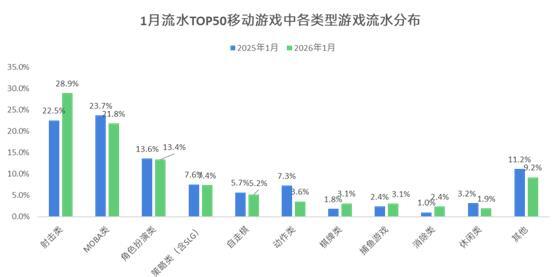 同时,2026年1月移动游戏市场数据显示,射击类游戏在流水TOP50产品中的流水份额达到28.9%,较去年同期显著提升6.4个百分点。该增长主要得益于新品推动、内容更新与长线运营的共同作用。