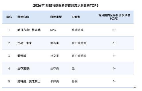 注:上述为2026年1月上线的移动游戏,并依据产品上线后30日国内全平台流水状况进行排名,上线不足30日的产品根据其目前流水状况推算首月流水。数据来源于伽马数据移动游戏流水测算,仅供参考。