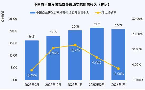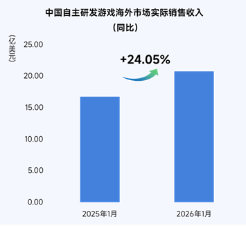 2026年1月,中国自主研发游戏在海外市场的实际销售收入达到20.77亿美元,同比增长24.05%,显示出中国游戏在全球市场持续增长的势头。尽管受海外节假日后自然回落影响环比下降了2.50%,但整体收入依然保持在较高水平。同比增长主要得益于成熟期产品的稳定表现和新产品的成功推出。