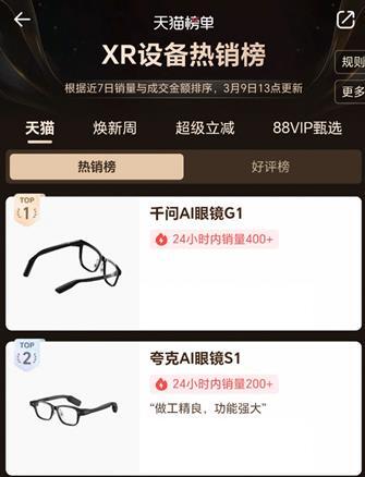 3月9日,千问AI眼镜G1开售第二日,登顶天猫XR设备热销总榜及抖音智能眼镜热销总榜,拿下双平台第一。