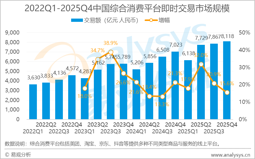 报告显示,2025年中国综合消费平台即时交易市场规模达到 29852亿元,同比增长21.4%;其中2025年第四季度市场规模为 8118亿元,同比增长15.6%,行业整体保持较快增长。报告分析认为,2025年第四季度,尽管进入秋冬季后饮料等外卖需求有所回落,但随着“双11”购物季的到来,促销热潮从传统电商延伸至即时交易场景,支撑了整体市场规模维持在较高水平。
