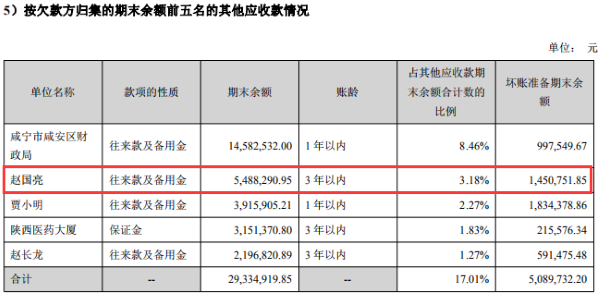振东制药2018年、2019年年报显示,赵国亮连续两年为被列入“按欠款方归集的期末余额前五名的其他应收款情况”表中,其中2019年,赵国亮因“往来款及备用金”性质,产生其他应收款期末余额548.83万元,占其他应收款期末余额合计数的比例3.18%,坏账准备期末余额145.08万元。