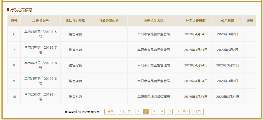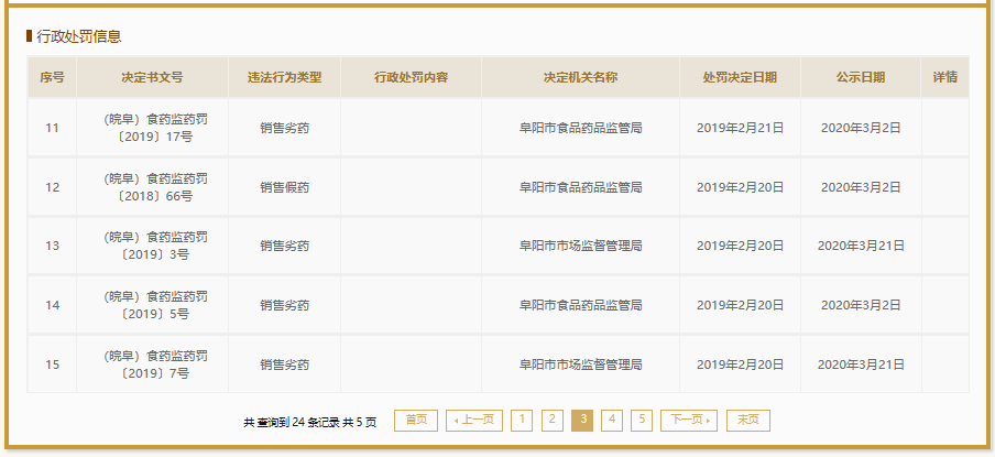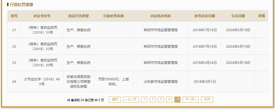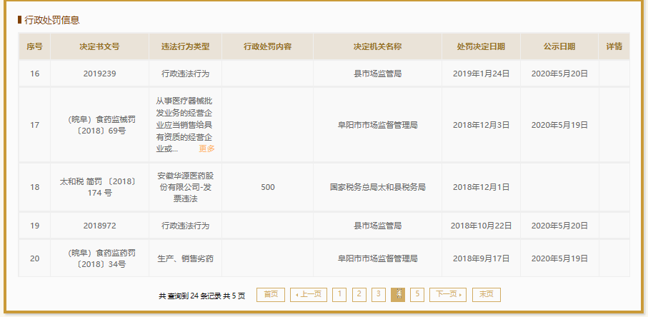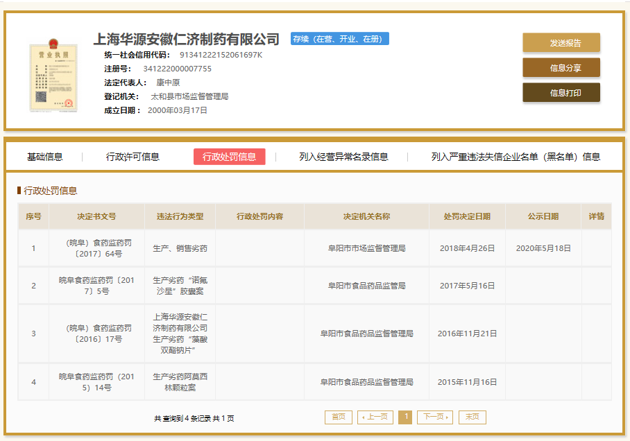 国家企业信用信息公示系统显示,2015年至今,上海华源安徽仁济制药有限公司4次因生产(或销售)劣药受罚,主要涉阿莫西林颗粒、藻酸双酯钠片、诺氟沙星等药品。2018年至今,安徽华源医药集团股份有限公司24次受罚,违法行为涉及生产销售劣(假)药,销售侵权乳膏等。其中,仅2019年,安徽华源医药集团股份有限公司就有14次因销售假劣药受罚记录。