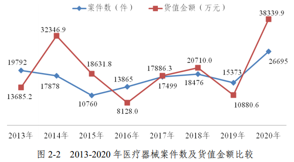 经济日报-中国经济网4月21日讯(记者 韩璐)国家药品监督管理局发布的《药品监督管理统计年度报告(2020年)》(以下简称“《报告》”)显示:2020年查处医疗器械案件2.67万件,同比增加73.65%,货值金额3.83亿元,同比增加252.37%。查处医疗器械案件数量前5位的省份为:河南、河北、山东、四川、湖南。