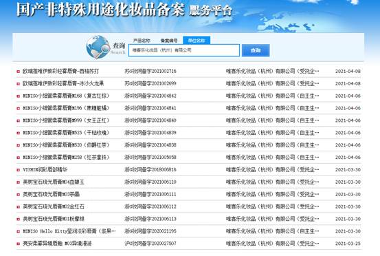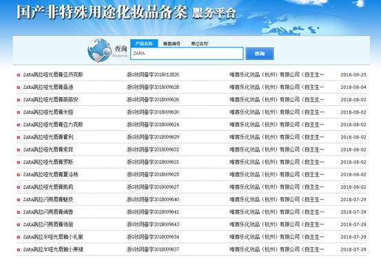 记者通过国家药监局网站查询得知,为Zara代生产化妆品产品的公司为唯客乐化妆品(杭州)有限公司,该公司也是名创优品、雅芳等品牌化妆品的代工厂之一。