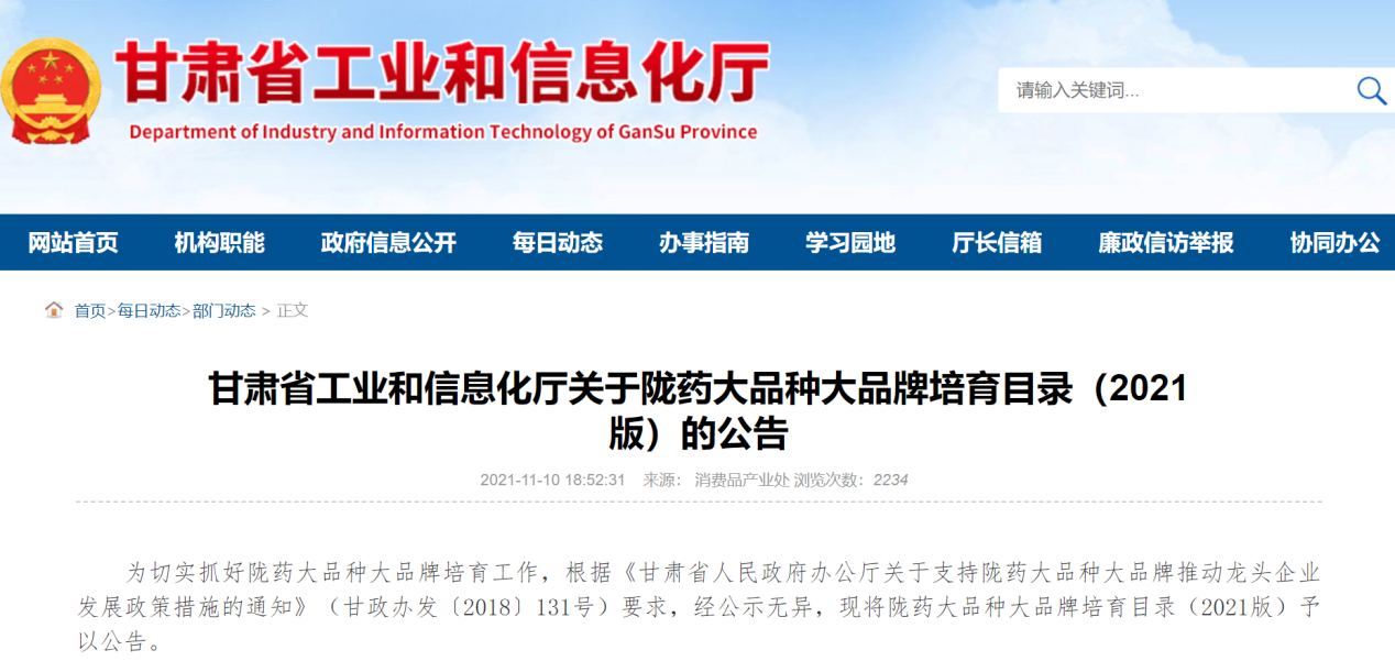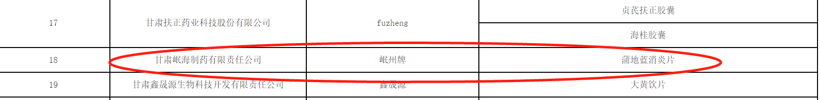 按上述通知要求,经公示无异,今年11月10日甘肃工信厅官网对外公告陇药大品种大品牌培育目录(2021版)。根据该公告,岷海制药公司拳头产品“岷州牌”蒲地蓝消炎片成功入选这一目录。