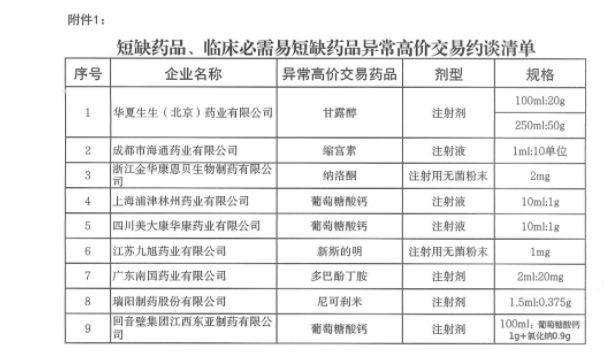 根据清单,10个被约谈药品分别为甘露醇(100ml:20g和250ml:50g)、缩宫素、纳洛酮、葡萄糖酸钙、新斯的明、多巴酚丁胺、尼可刹米,涉及华夏生生(北京)药业有限公司、成都市海通药业有限公司、浙江金华康恩贝生物制药有限公司、上海浦津林州药业有限公司、四川美大康华康药业有限公司、江苏九旭药业有限公司、广东南国药业有限公司、瑞阳制药股份有限公司、回音壁集团江西东亚制药有限公司共9家供应企业。其中,葡萄糖酸钙供应企业涉及3家。