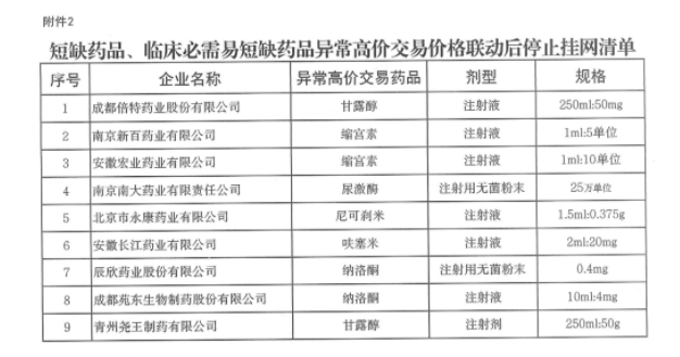 另还有成都倍特药业股份有限公司、南京新百药业有限公司、安徽宏业药业有限公司、南京南大药业有限责任公司、北京市永康药业有限公司、安徽长江药业有限公司、辰欣药业股份有限公司、成都苑东生物制药股份有限公司、青州尧王制药有限公司共9家企业的9个药品品规被停止挂网,不再约谈。