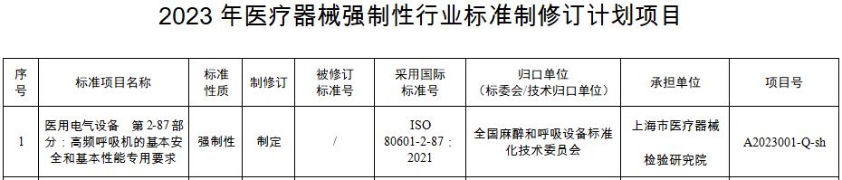 标准项目“医用电气设备 第2-87部分:高频呼吸机的基本安全和基本性能专用要求”将由上海市医疗器械检验研究院作为承担单位、全国麻醉和呼吸设备标准化技术委员会作为归口单位,按照国际标准ISO 80601-2-87:2021予以制定。其余电动洗胃机、血压传感器、骨接合植入器械金属接骨螺钉、金属接骨板、中医器械 电针治疗仪、一次性使用去白细胞滤器、激光治疗设备调Q眼科激光治疗机、心肺转流系统 一次性使用动静脉插管、血液灌流设备等14项在现有行业标准基础上进行修订,承担单位包括上海市医疗器械检验研究院、天津市医疗器械质量监督检验中心、山东省医疗器械和药品包装检验研究院、浙江省医疗器械检验研究院、广东省医疗器械质量监督检验所、北京大学口腔医学院口腔医疗器械检验中心。
