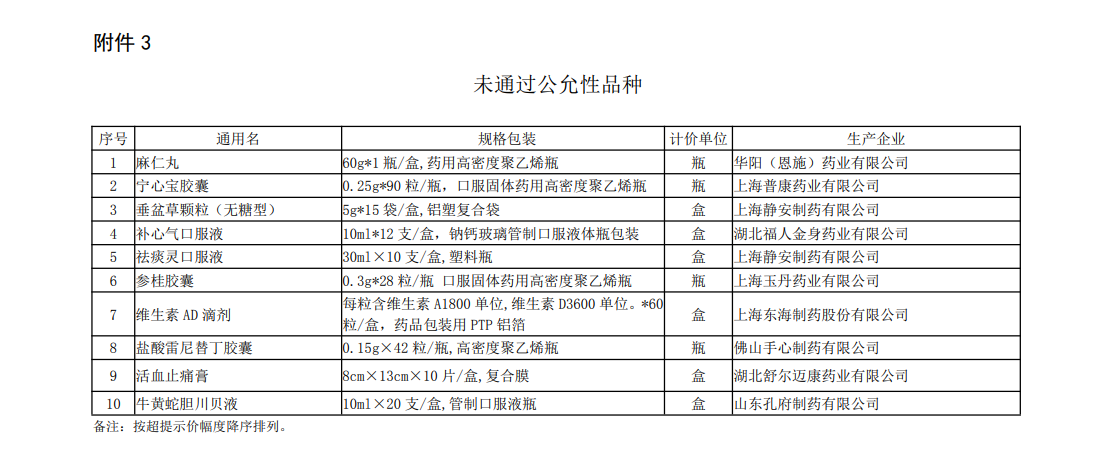 譬如,新申请超“黄线”品种名单中,北京同仁堂科技发展股份有限公司制药厂麻仁润肠软胶囊、云南白药集团股份有限公司云南白药气雾剂系独家品种;原在库超“黄线”品种名单中,浙江泰利森药业有限公司瑞格列奈二甲双胍片(II)是独家品种;未通过公允性品种名单中,湖北福人金身药业有限公司补心气口服液、上海玉丹药业有限公司参桂胶囊是独家品种;重点监控品种名单中,吉林津升制药有限公司注射用二羟丙茶碱为独家品种。
