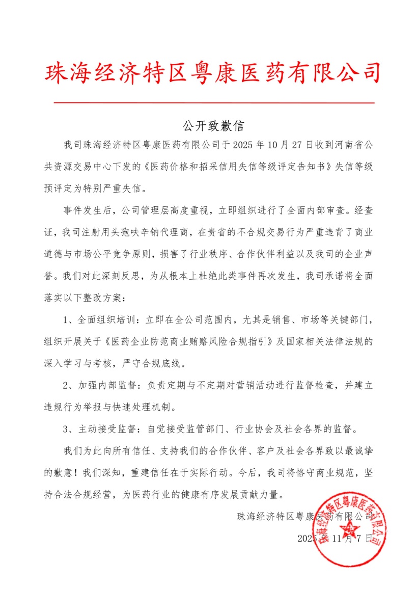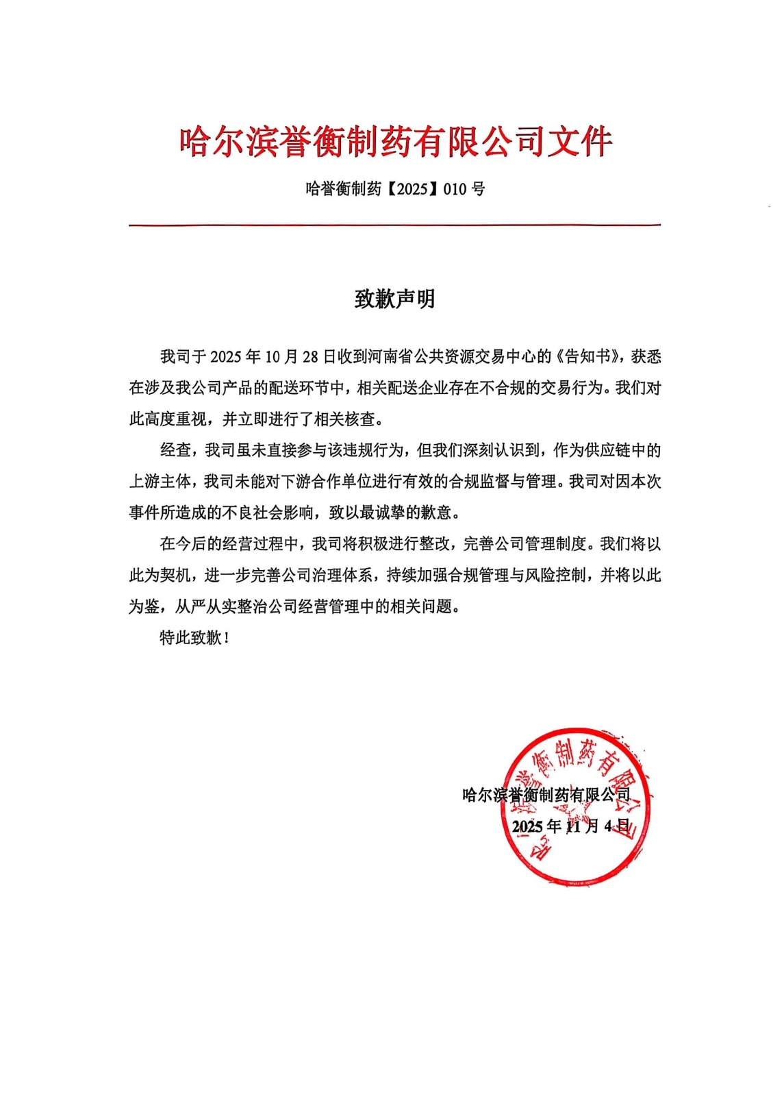 根据公开致歉信,在涉及哈尔滨誉衡制药有限公司产品的配送环节中,相关配送企业存在不合规的交易行为。吉林四环制药有限公司生产的产品“脑苷肌肽注射液”,其合作配送企业在河南省存在不合规交易行为。珠海经济特区粤康医药有限公司注射用头孢呋辛钠代理商,在河南省发生不合规交易行为,粤康医药收到河南省公共资源交易中心下发的《医药价格和招采信用失信等级评定告知书》失信等级预评定为特别严重失信。