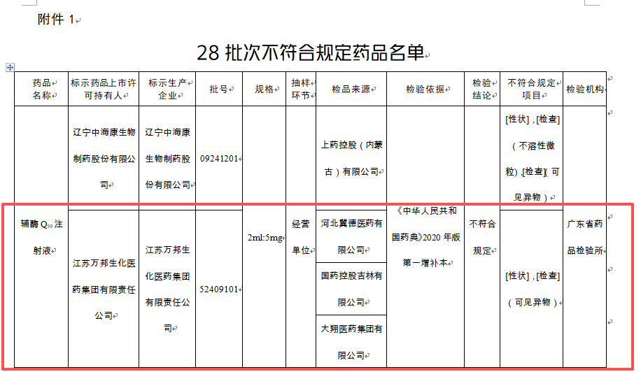 中国经济网1月7日讯 国家药监局1月6日发布的《关于28批次不符合规定药品的通告》显示,经广东省药品检验所检验,标示为江苏万邦生化医药集团有限责任公司生产的辅酶Q10注射液不符合规定,不符合规定项目涉及性状、可见异物。