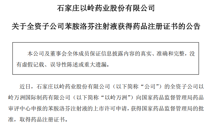以岭药业化药专利新药苯胺洛芬注射液获批上市