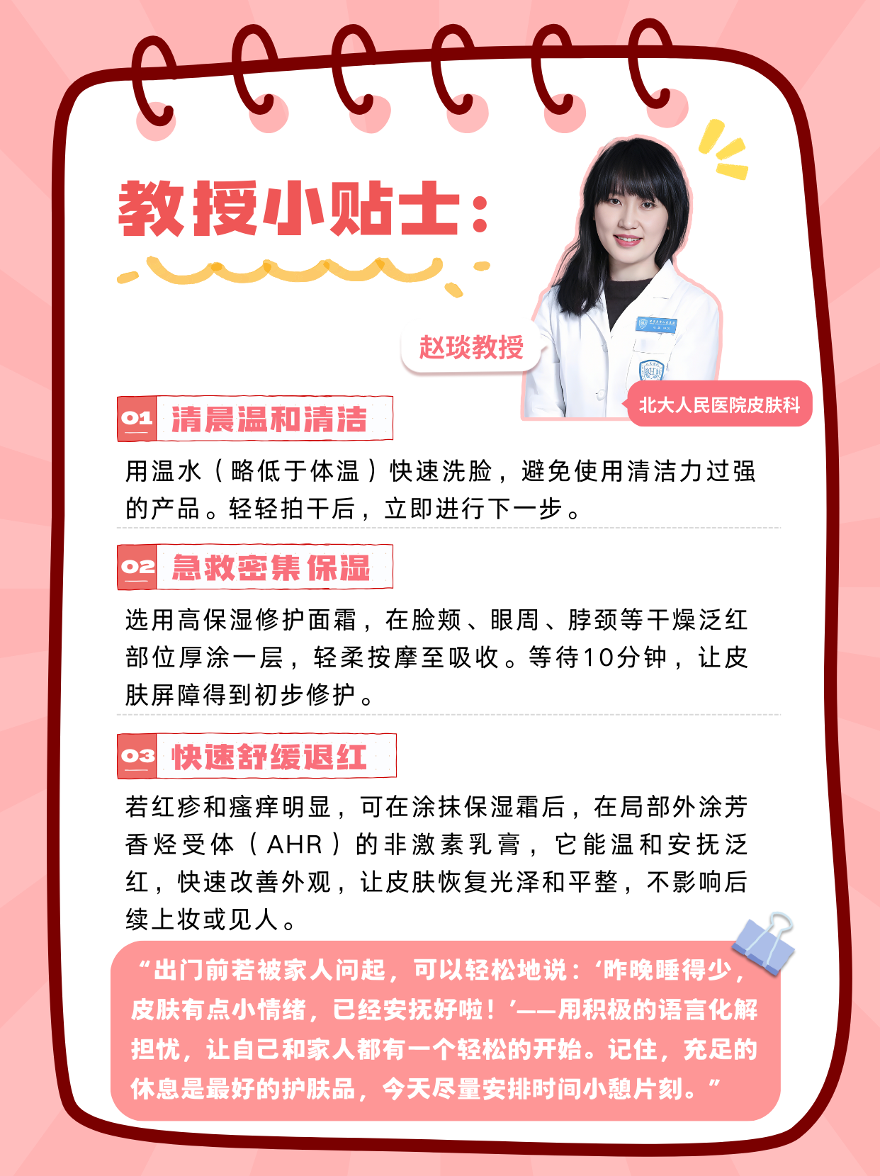“出门前若被家人问起,可以轻松地说:‘昨晚睡得少,皮肤有点小情绪,已经安抚好啦!’——用积极的语言化解担忧,让自己和家人都有一个轻松的开始。记住,充足的休息是最好的护肤品,今天尽量安排时间小憩片刻。”