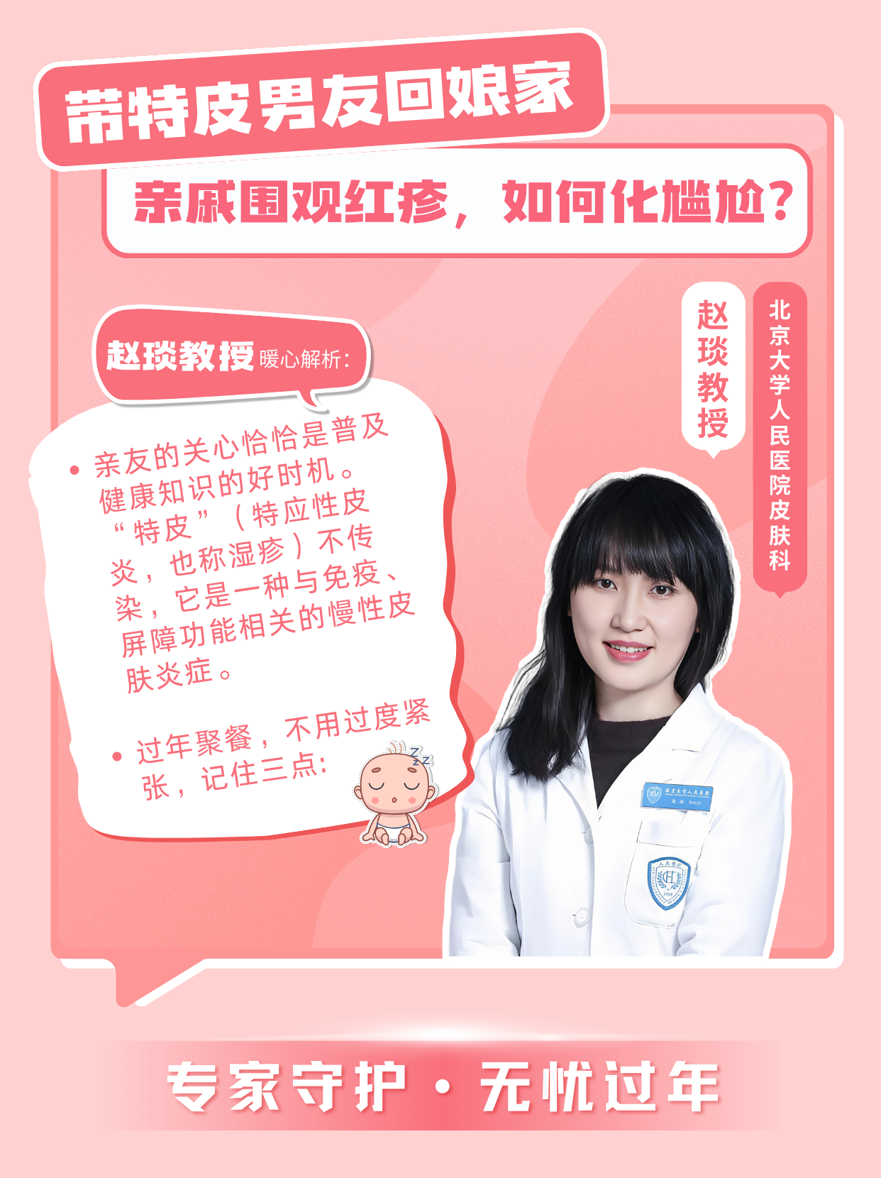 “亲友的误解恰恰是普及健康知识的好时机。‘特皮’(特应性皮炎,也称湿疹)不传染,它是一种与免疫、屏障功能相关的慢性皮肤炎症。过年聚餐,不用过度紧张,记住三点: