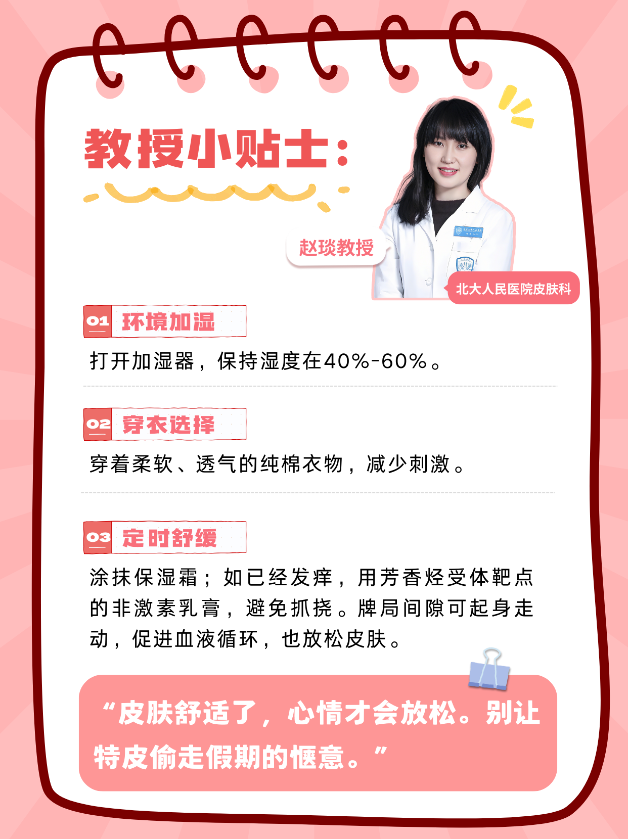 “皮肤舒适了,心情才会放松。别让特皮偷走假期的惬意。”