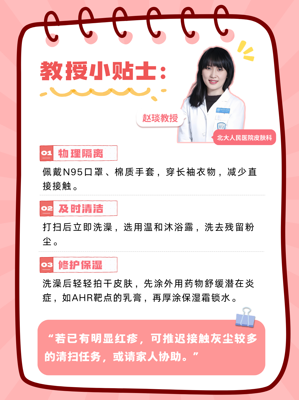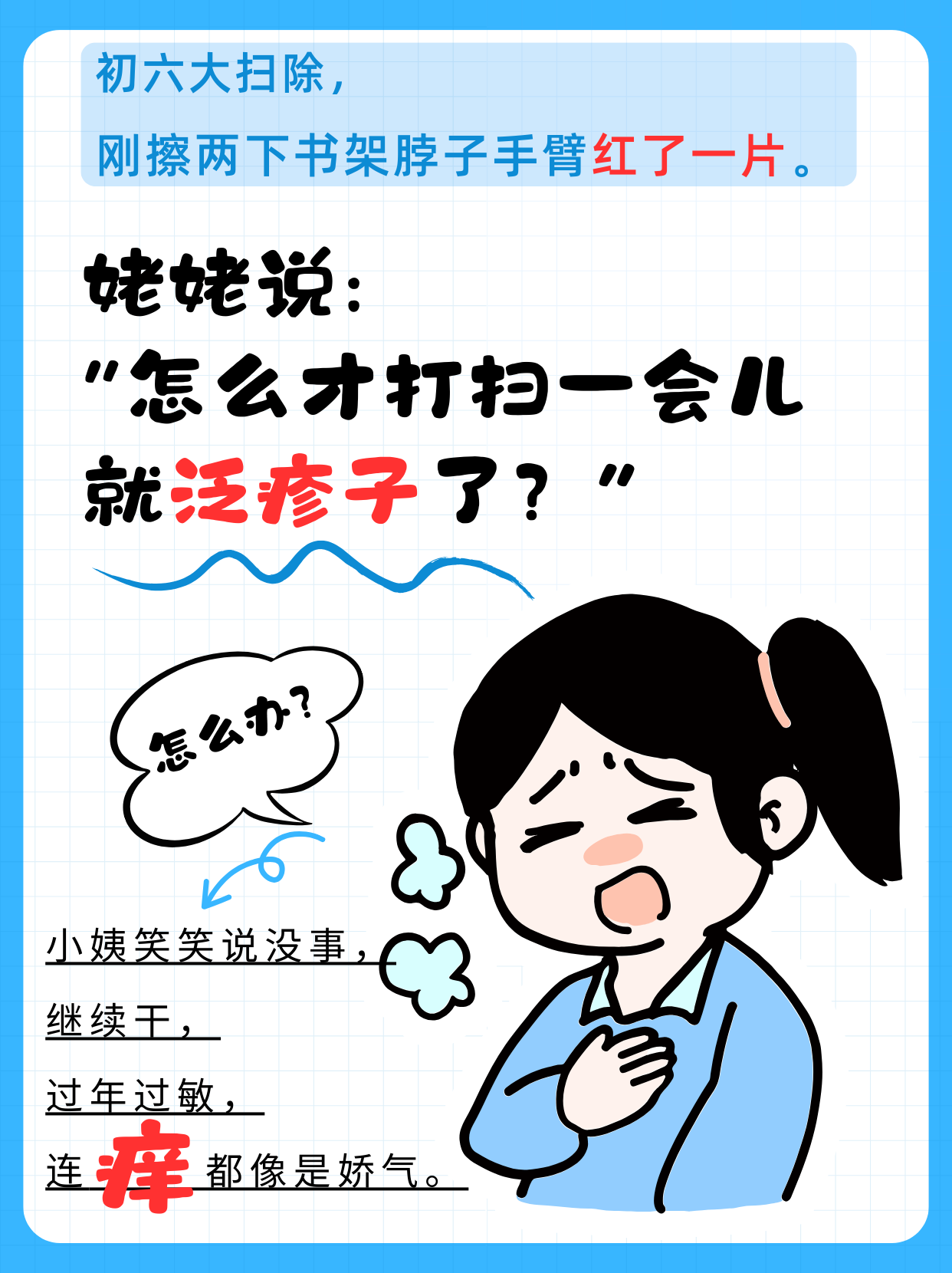 “若已有明显红疹,可推迟接触灰尘较多的清扫任务,或请家人协助。”