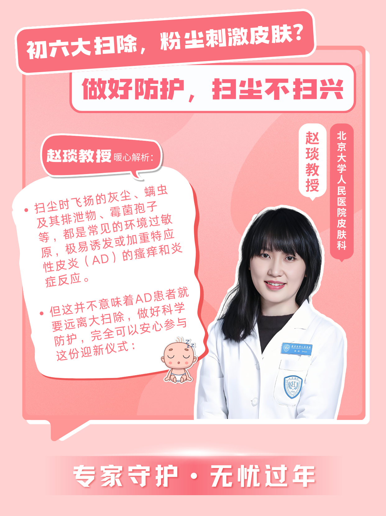 “扫尘时飞扬的灰尘、螨虫及其排泄物、霉菌孢子等,都是常见的环境过敏原,极易诱发或加重特应性皮炎(AD)的瘙痒和炎症反应。但这并不意味着AD患者就要远离大扫除,做好科学防护,完全可以安心参与这份迎新仪式: