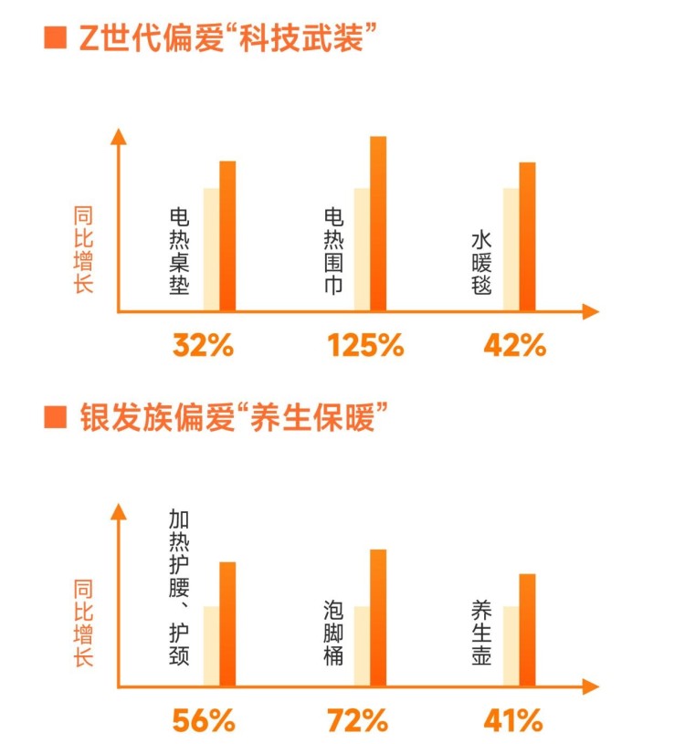 不同消费群体在取暖方式上不尽相同。报告表明,男性更喜欢“加热整屋”,例如暖风机、油汀、空调等取暖电器。女性青睐“精准呵护”,通过暖手宝、加热围巾、暖脚器等实现全方位保暖。“Z世代”热衷“科技武装”,电热桌垫、加热围巾、水暖毯销售分别同比增长32%、125%、42%,银发族则偏爱“养生保暖”,加热护腰护颈、泡脚桶、养生壶等“走俏”。