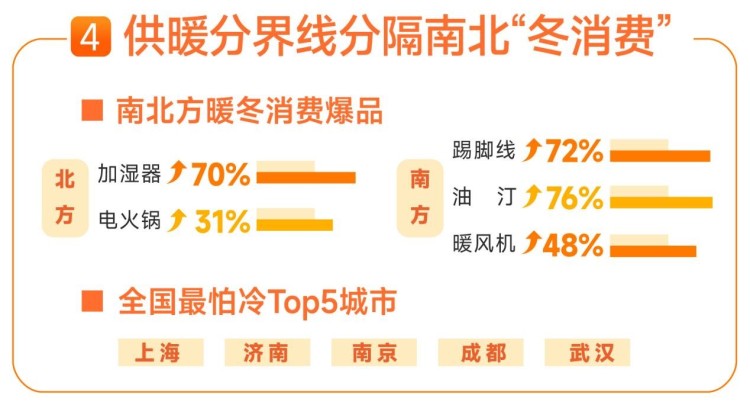 供暖分界线分隔南北“冬消费”。报告显示,南方地区踢脚线、油汀、暖风机销售分别同比增长72%、76%、48%,北方地区供暖干燥,加湿器、电火锅成为北方人过冬的“标配”。上海、济南、南京、成都、武汉的取暖消费增速走在全国前列,成为全国最怕冷TOP5城市。