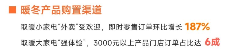 “断崖式”降温来袭,取暖小家电“外卖”成为消费者即时御寒的新选择,取暖小家电订单量环比增长187%。取暖大家电体验属性明显,线下看得见、摸得着的体验式消费能大大提升消费者的购买决策效率。11月22日以来,苏宁易购门店3000元以上取暖大家电订单占比达6成。