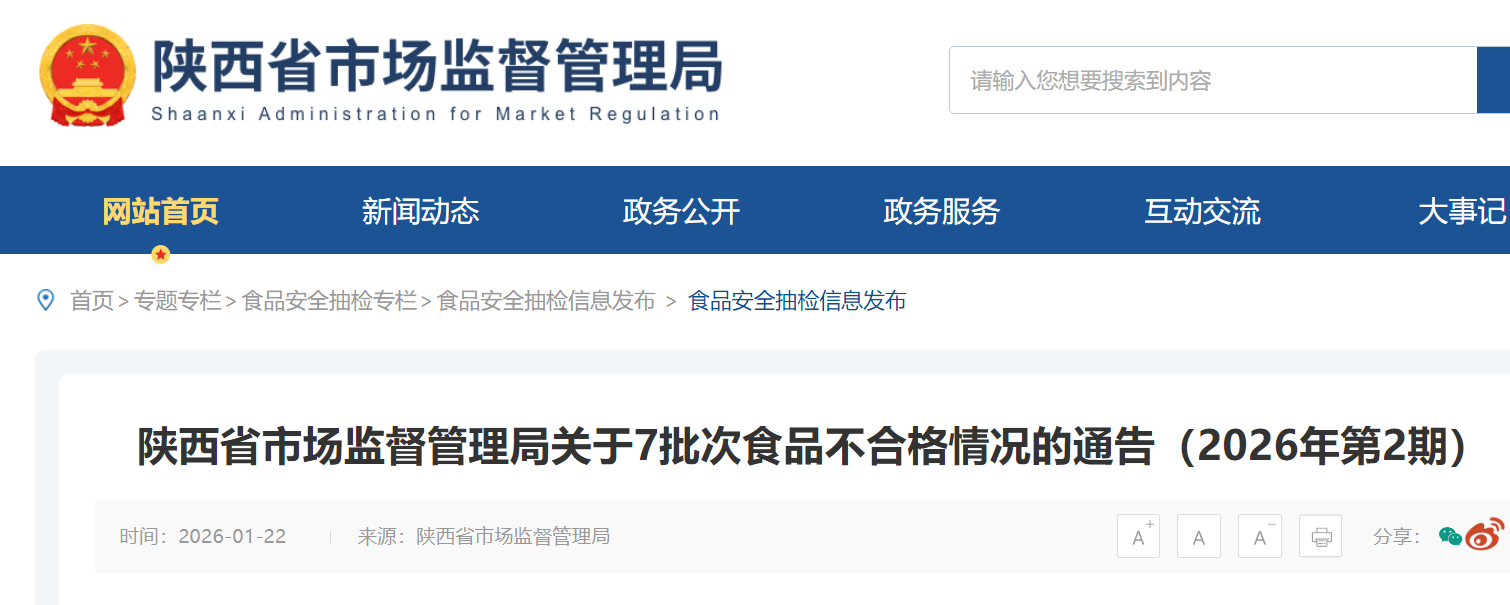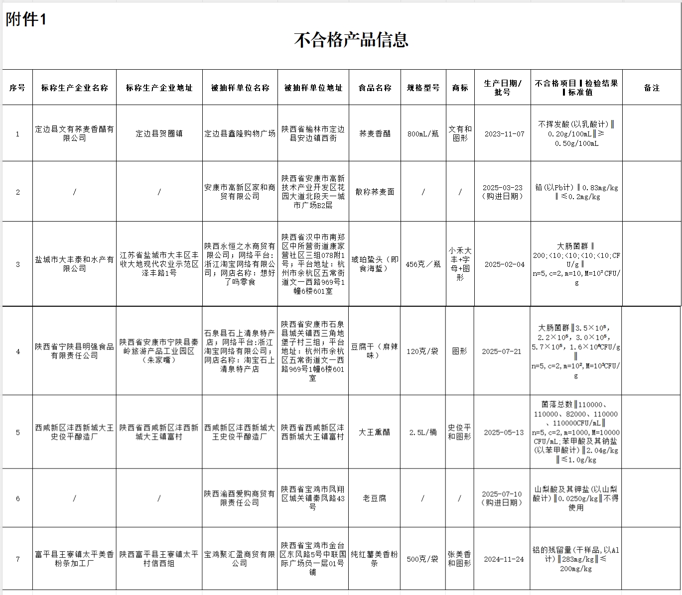 陕西省市场监督管理局组织的食品安全监督抽检中,检出7批次样品不合格。产品抽检结果可查询https://spcjsac.gsxt.gov.cn/。