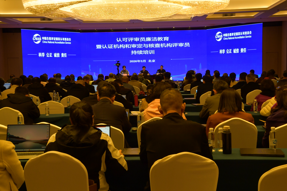 2026年3月30日至31日,中国合格评定国家认可委员会(CNAS)在京举办了2026年认可评审员廉洁教育暨认证机构和审定与核查机构评审员持续培训会。CNAS秘书长、认可中心党委书记、主任陈建良出席并为评审员作廉洁教育专题培训,认可中心党委副书记兼纪委书记谢冬伟主持本次培训会。