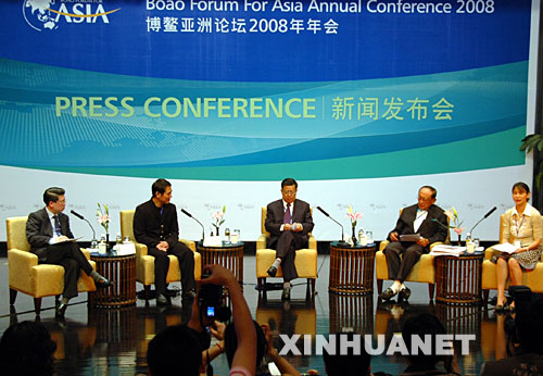 4月11日,博鳌亚洲论坛秘书长龙永图(左三)、博鳌亚洲论坛理事长拉莫斯(左四)和中国红十字会博爱大使、本届年会特殊嘉宾李连杰(左二)出席新闻发布会。当日,博鳌亚洲论坛2008年年会举行新闻发布会。博鳌亚洲论坛2008年年会各项筹备工作已经就绪,超过1700名来自亚洲和世界其他地区的政府官员、企业代表、专家学者、媒体记者等将参加本次年会。 新华社记者 鱼澜 摄