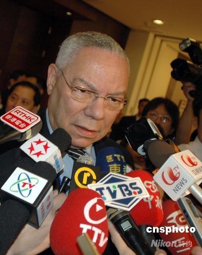 一个半小时后论坛结束,鲍威尔在侍卫引导下快步走出门外,被挡在一旁的一位台湾女记者急中生智,直呼“鲍卿”并自报家门。鲍闻呼随即转身走向记者,不想“呼啦”一下子涌上二十多位记者将他团团围住,许多摄影师只得将机子举过头顶拍摄。
