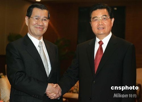 4月12日下午,国家主席胡锦涛在海南省博鳌会见出席博鳌亚洲论坛2008年会的两岸共同市场基金会董事长萧万长。中新社发任晨鸣摄