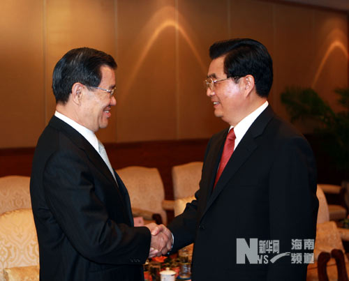 4月12日,中共中央总书记胡锦涛在海南博鳌会见萧万长先生率领的台湾两岸共同市场基金会代表团一行。新华社记者 鞠鹏 摄