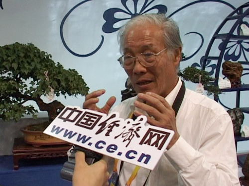 潜锦生:展馆里展出的品种共有60多种,其中主打的品种有两个,一是顽石,第二是盆景,其中包括树状盆景和山水盆景,根据展品的种类我们将其分为六个部分。除此之外还有鲜花,插花等其他一些花品。