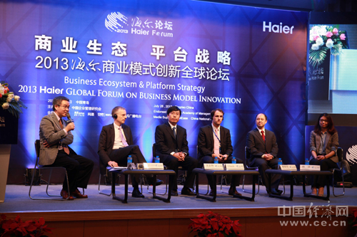由中国企业管理研究会主办的“2013海尔商业模式创新全球论坛”于2013年7月28日在山东青岛举行。图为以“用户体验引领下的开放平台”为主题的圆桌对话阶段。参与嘉宾依次为王汉华、维克托·迈尔-舍恩伯格、王正刚、Ulrich、黄朗阳、杨洪(从左到右)。