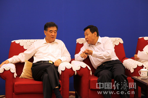 6月17日,以“社会共治、同心携手维护食品安全”为主题的2013年全国食品安全宣传周主场活动在北京举行。国务院副总理汪洋出席活动并讲话。图为国务院副总理汪洋与国家食品药品监督管理总局局长张勇交流。 中国经济网 王耀峰/摄