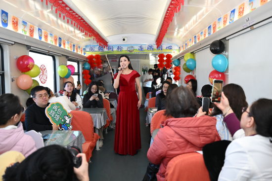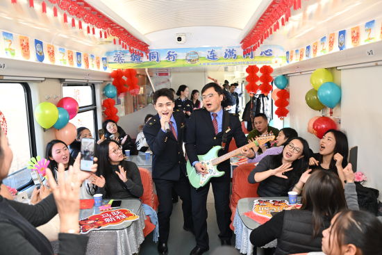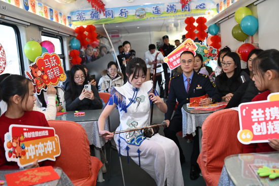 文艺表演环节精彩迭出,为旅途注入鲜活气息。一曲《美丽家园》唱出游子对故乡的深情眷恋,唤起旅客心中共同的团圆情结;舞蹈《草原花正开》以舒展的舞姿、明快的节奏,勾勒出草原的辽阔生机,仿佛提前带来春的气息;二胡独奏《赛马》激昂奔放,弦音如蹄,奏响新春的蓬勃朝气,引来阵阵掌声;《乌兰巴托的夜》深情悠远,抚慰旅途思念,增添一抹诗意的温暖;最后的器乐弹唱《奔跑》以熟悉旋律点燃全场,传递出向前奋进的青春力量。