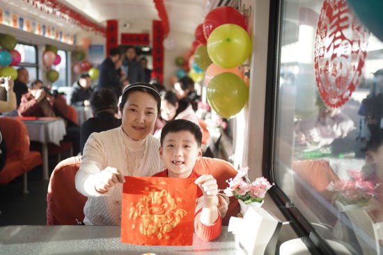 趣味互动与安全科普并行,让旅途安心亦有趣。活动围绕铁路乘车常识与反诈知识设置两轮有奖问答,内容涵盖12306购票流程、儿童票新规、电信诈骗防范等实用话题。旅客踊跃参与,答对者均获赠列车准备的精美纪念品。乘警结合题目现场剖析诈骗手法与出行隐患,助力旅客筑牢安全意识。列车还为小朋友准备了非遗剪纸和拓印福字体验,孩子们在动手创作中感受传统年味,一幅幅红艳剪纸、一张张饱满“福”字,点亮了车厢,也传递出新春的美好祝愿。