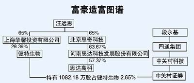 商报讯(记者张景宇)资本市场与富豪之间仿佛是一对孪生兄弟。在刚刚结束的《福布斯》富豪榜评选中,国内前100名富豪中有60%以上的人拥有上市公司。这其中,既有丁磊、陈天桥、江南春、马化腾等靠公司直接上市而平步《福布斯》榜的富豪,也有荣智健、黄光裕、朱孟依、刘永好等在实业方面做得风声水起,而后进军资本市场成就“霸业”的一代巨贾。人们无法否认,证券市场在事实上已经成为中国富豪们创富的“加速器”。 这是一场只有富豪才有资格参与的游戏。在IPO、资本运作、收购、毒丸等曾经陌生的名词正变得越来越熟悉的同时,我们也能够看到,它们的背后无一不有资本运作高手晃动的身影。今天,得益于市场日益公开透明和资讯的发达,我们有机会看到这些富豪在股市中千丝万缕的联系。这些来自于五湖四海的富豪们,通过资本的纽带,联结成一荣俱荣的利益共同体,演绎着一个又一个财富神话。 本报今起分上、中、下三期,推出部分有代表性的中国股市“富豪共同体”的造富图谱。 中国股市“富豪共同体”造富图谱揭秘(上) 段永基史玉柱汪远思:“黄金搭档”能走多远? “金风玉露一相逢,便胜却人间无数”。资本市场与富豪之间仿佛是一对孪生兄弟,在刚刚结束的《福布斯》富豪榜评选中人们发现,国内前100名富豪中有60%以上的人拥有上市公司。这其中,既有丁磊、陈天桥、江南春、马化腾等靠公司直接上市而平步《福布斯》榜的富豪,也有荣智健、黄光裕、朱孟依、刘永好等在实业方面做得风声水起,而后进军资本市场成就“霸业”的一代巨贾。 在他们的财富历程中,资本市场仿佛成为一种黏合剂和催化剂,在促进个人财富由量变到质变的同时,也将来自于五湖四海的富豪们用资本的纽带联结在一起,形成一荣俱荣的利益共同体。 本报今起分上、中、下三期,推出部分有代表性的中国股市“富豪共同体”的造富图谱。 “黄金搭档” 段永基VS史玉柱 今年的《福布斯》富豪榜由过去的100名增加到400名,这让上市公司健特生物的幕后运作者史玉柱走上了前台。在最新的富豪榜中,史玉柱以上海健特的6亿元人民币身家名列第312位。不过,让人比较费解的是,被誉为史玉柱“精神救赎者”的四通控股CEO段永基却依然榜上无名。 据记者了解,早在2002年至2003年时,段永基就曾以个人名义在1美元多的价位购买了500万股新浪股票,后来每股赚了20倍。照此计算,段永基的财富至少应在1亿美元以上。看来,《福布斯》富豪榜的编制者范鲁贤很可能在段永基的财富数字上看走了眼。 我们先来看看段永基与史玉柱之间的合作。2003年,经历了1997-1998年“巨人风波”的史玉柱重新回到了公众的视野。这一年的12月份,四通控股与Central New达成收购协议,收购价格为11.7亿港元。当时,Central New持有黄金搭档生物科技75%股本权益,通过这次合并,史玉柱立即得到了6亿多元人民币现金。 事实上,段永基与史玉柱的合作远不止这些。早在2001年,上海华馨投资收购原青岛国货(后改名健特生物)时,段永基便与史玉柱有默契。在2001年初至2003年7月这段时间,健特生物受“脑白金”概念的刺激一路飙升,从3元启动,最高涨至15.34元。这期间,中关村证券始终作为第一大流通股东参与其中。众所周知,中关村证券正是段永基旗下的一家子公司。 超级幸运的汪远思 健特生物的炒作又引出另一位富豪——2005年《福布斯》排行榜中名列第246位的思达高科老总汪远思,汪远思除拥有上市公司思达高科外,同时也是持有上海华馨投资65%股权的第一大股东。正是通过上海华馨投资,史玉柱将“脑白金”的生产环节装入上市公司健特生物,为健特生物的炒作提供了概念。 说起汪远思,他可是一位颇有传奇色彩的人物。思达集团前身是由汪远思1988年带领5个年轻人创办的一个小电子研究所,当年这家名为郑州思达电子研究所的小公司仅以6个人和两万元为资本,从制造销售电子仪表起步,经过数年发展,最后于1996年12月在深交所成功上市,成为全国第二、河南首家上市的民营公司。 思达高科的成功上市使汪远思意识到,资本运作和证券市场显然比经营实业更有魅力。于是,他重新制定了发展战略,希望能逐步控制至少3家上市公司。1997年12月,河南思达受让了石劝业(600892.SS现名湖大科教,已停牌)的1492.7万股法人股,从而成为石劝业的第一股东。 然而,汪远思的发展战略使得资金的需求规模迅速扩大,在另外5大股东看来,公司的发展步伐应该更稳健一些,这种资本运作显然风险太大了。正是这种分歧,导致汪远思于1999年9月出走。业内人士告诉记者,实际上在汪远思正式出走的前7个月,也就是1999年2月起,他就已经不再参与集团公司的决策了。 汪远思在回忆这段往事时曾透露,当时从思达高科出来时几乎是净身出户,思达集团只给了他几百万元的创业资金,让他另立“山头”,于是就有了后来与史玉柱的合作。2000年9月,汪远思参与投资上海华馨投资有限公司。不过,令人不解的是,当时上海华馨投资的注册资金高达1.8亿元,汪远思占65%的股份,照此计算他要拿出1.17亿元的真金白银出来。 显然,光靠思达集团给的“遣散费”是远远不够的,那么这笔钱是从哪儿变出来的呢?回过头看看当时石劝业的股价走势也许能找到一些答案。石劝业走势图上显示,从1999年2月至2000年6月期间,该公司股价出现了一波爆炒,股价