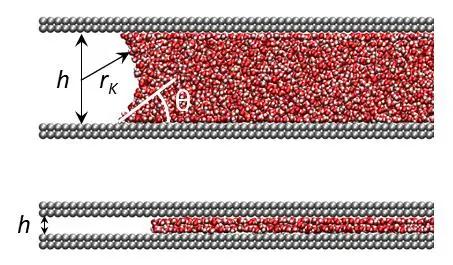 为了解释实验现象,王奉超教授放弃了原开尔文方程中弯液面的曲率半径、接触角等在微观尺度下无法准确定义的概念,认为石墨烯通道内的毛细凝聚主要是因为固体和液体界面的相互作用。